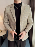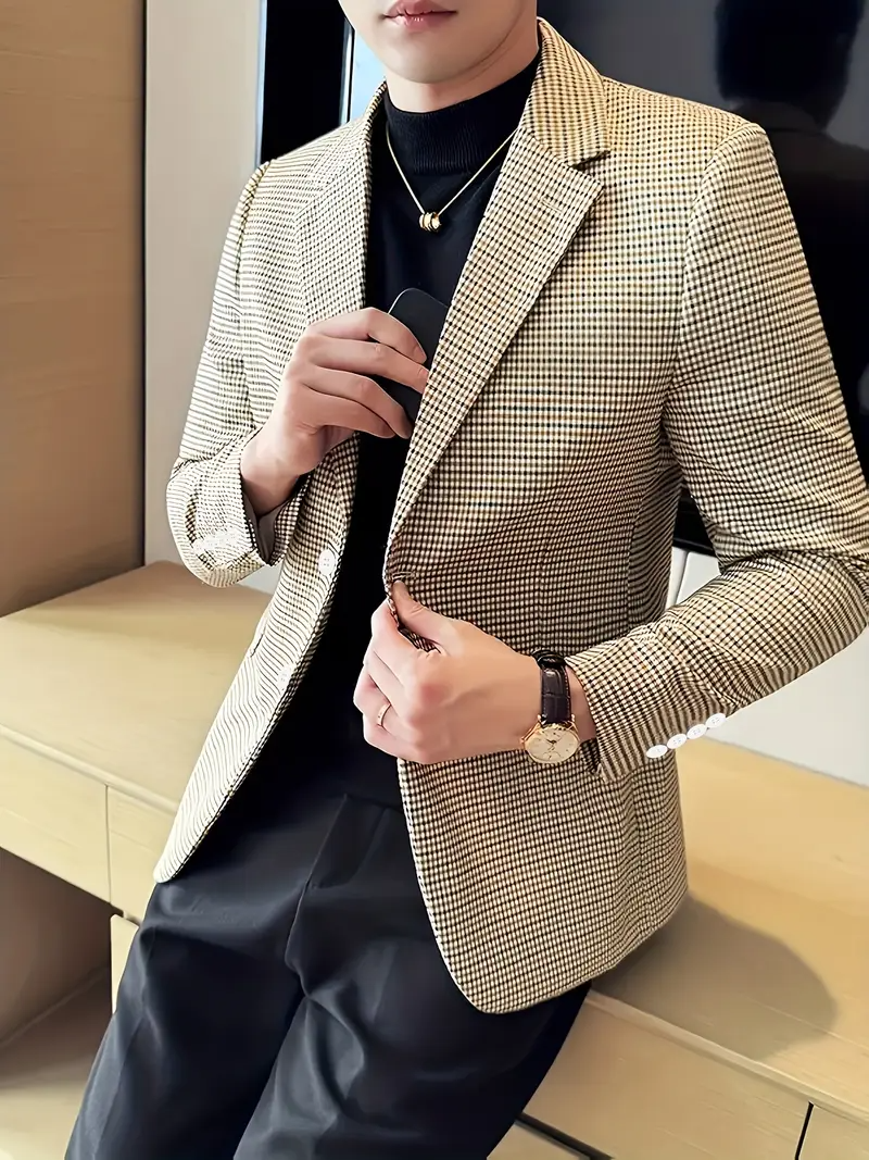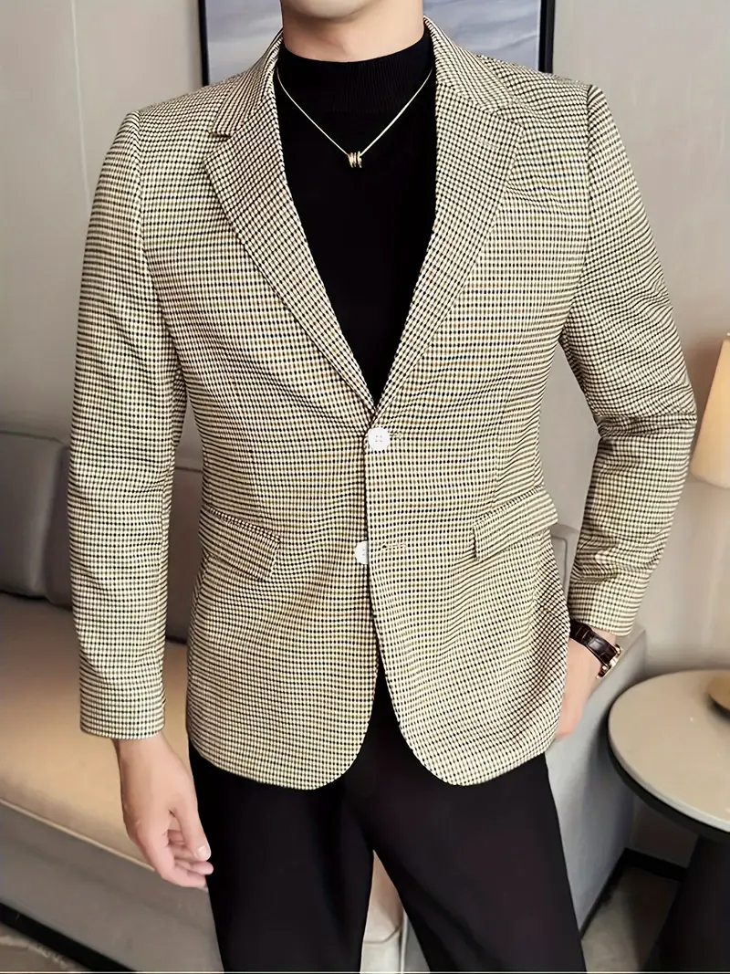 This men's blazer features a houndstooth check pattern in beige and black colors. The blazer has a notched lapel collar that frames the neckline. Two front buttons serve as the primary closure mechanism. Flap pockets are positioned on both sides of the lower front.