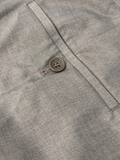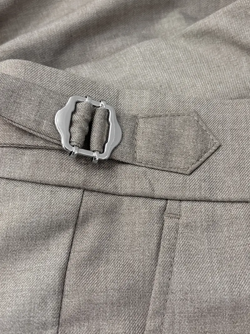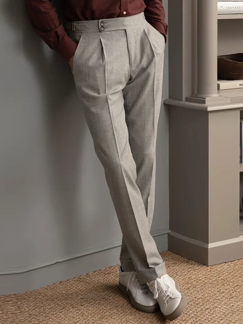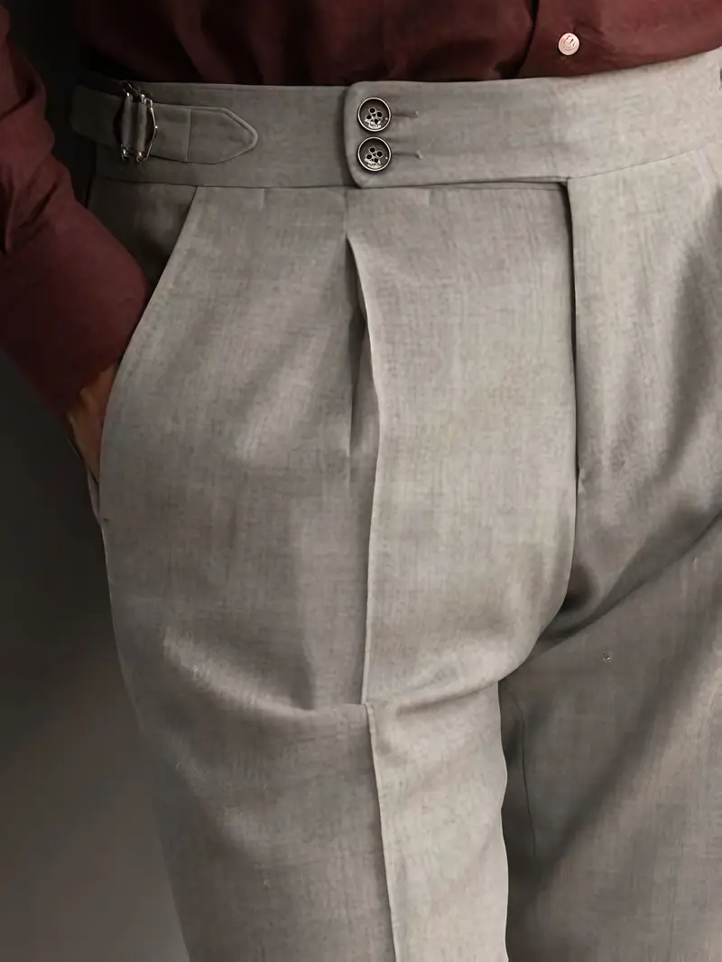 These men's trousers feature a high-rise waist with an extended waistband design. Side adjuster tabs with two buttons allow for waist size modification. Double pleats are positioned at the front of the trousers below the waistband. The legs have a straight cut with slight tapering toward the hem.